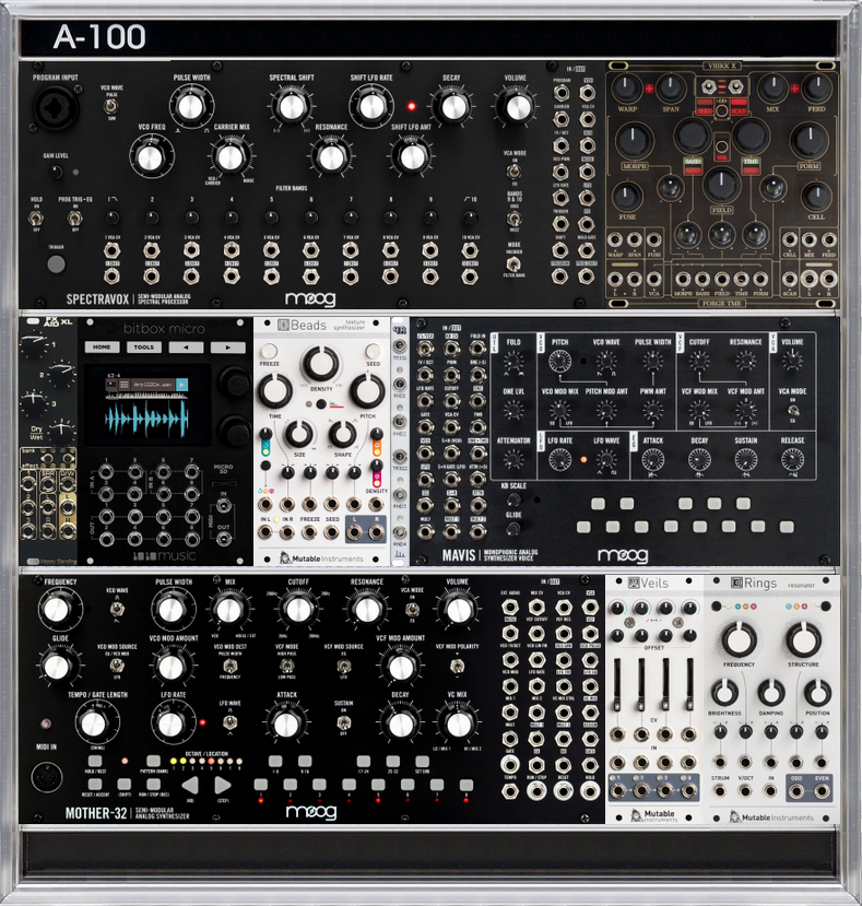 Eurorack-Modular-System bestehend aus: Moog Mother 32 > Mutable Instruments Veils V2 > Mutable Instruments Rings > Moog Mavis > Transient Modules 4R > Mutable Instruments Beads > Bitbox micro > Happy Nerding FX Aid XL > Moog Spectravox > Forge TME Vhikk X.