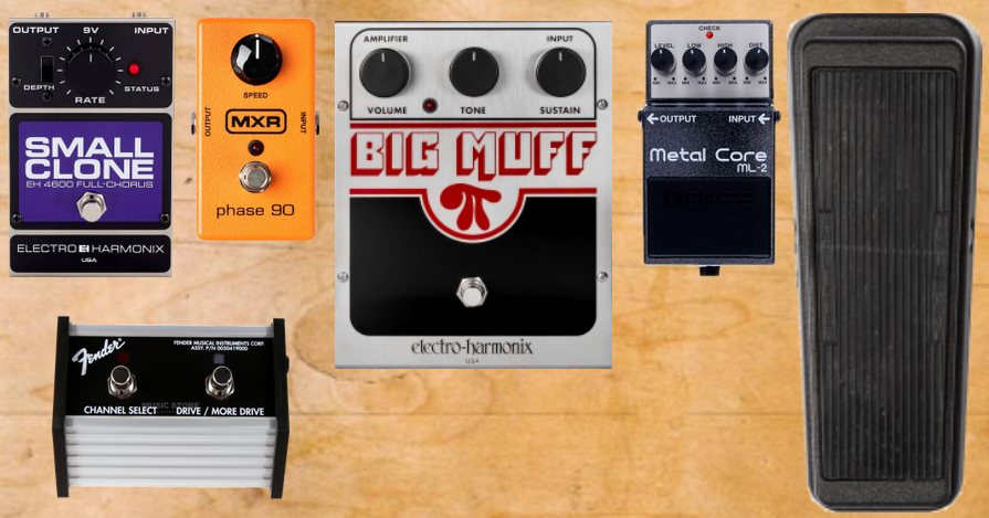 Pedalboard bestehend aus: Electro-Harmonix Small Clone > MXR Phase 90 > Electro-Harmonix Big Muff > BOSS Metal Core ML-2 > Dunlop Cry Baby > Fender Two-Button Footswitch.
